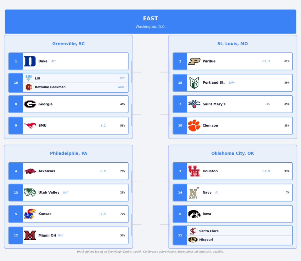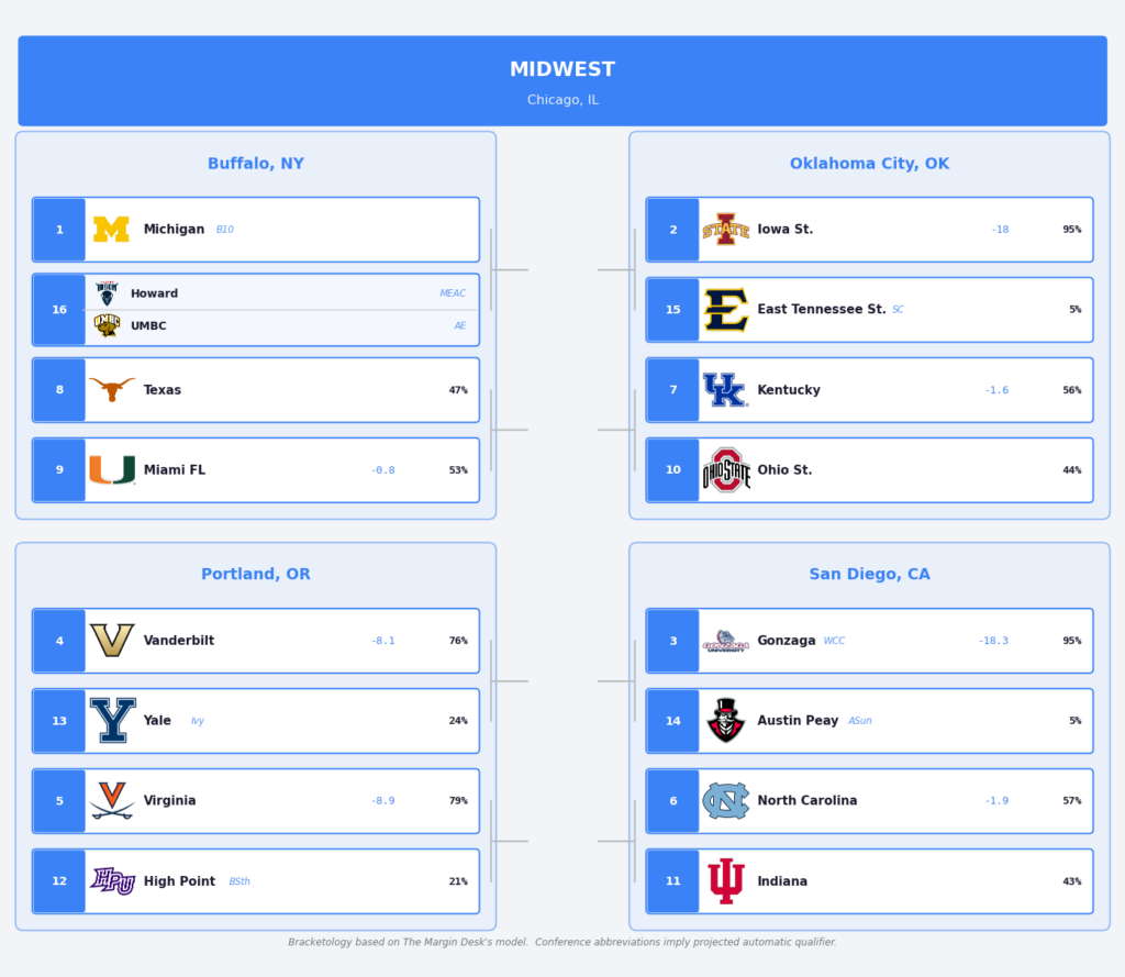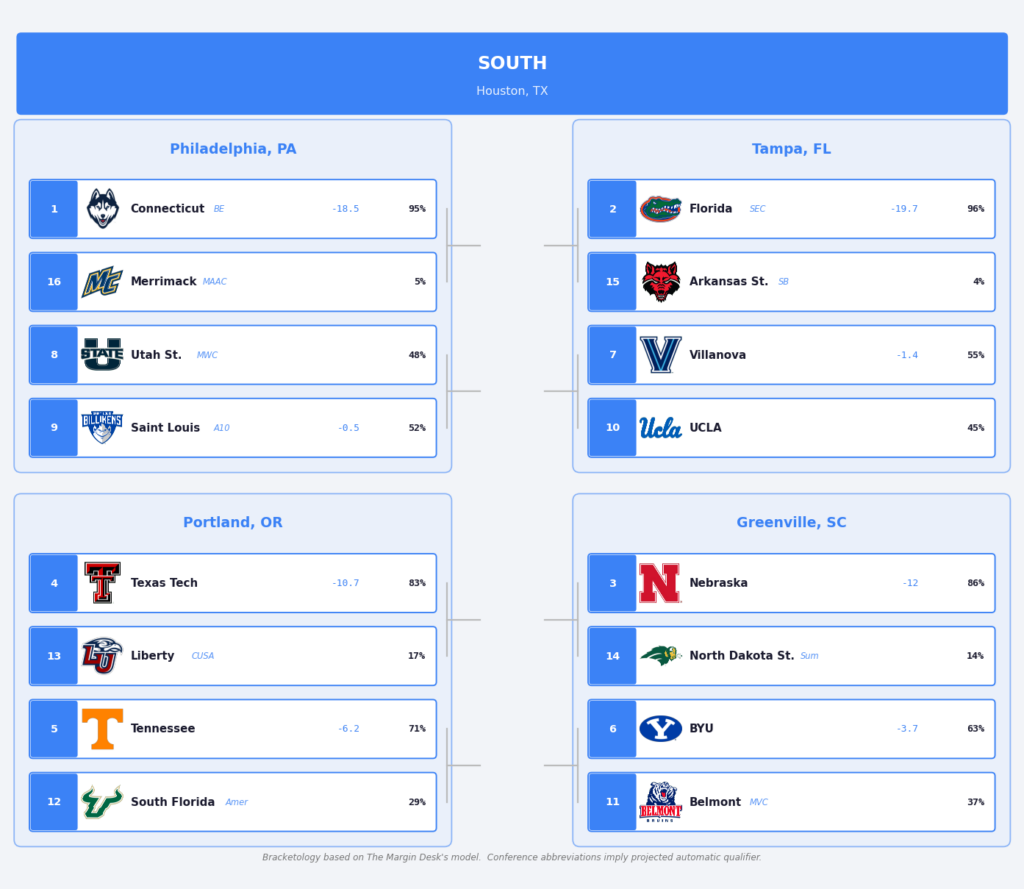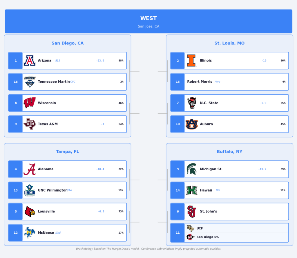 Scroll to the bottom for the entire projected bracket, including projected spreads and win probabilities for each matchup.